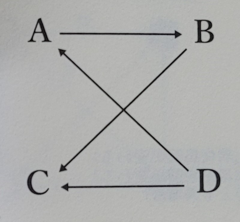 기본적으로 이것이 바로 삼분법의 형태입니다. 이항대립을 겸하는 제3항, 제3 렘마에 모든 항이 걸리고 어느 쪽으로도 치우치지 않는 구조가 됩니다. 이것을 말한 시점(時點)에서 원인으로서 ‘포함하는 것/포함되는 것’의 이항대립도 풀립니다. 그 세 종류의 이항대립이 최소의 축약입니다. 이제 아시겠지만, 이러한 구조는 ‘닭싸움 서열(picking order)’과 같습니다. 그림 3에서처럼 A가 B를 찌르고 B가 C를 찌르고 C가 D를 찌르고 D가 A를 찌릅니다. 마치 닭들이 서열 싸움하는 것 같죠. 신화의 구조는 이런 식이라는 것을 레비스트로스는 말합니다. 그런데 이항대립의 두 항을 그것들의 이중성으로 풀어내는 방식이라고 하면, 가령 이 그림의 위와 아래를 “원 오퍼레이션(one operation)”[점원 혼자서 점포를 운영하는 것]으로 교체할 뿐이면 상관적인 것에 머뭅니다. 각각의 항을 다른 항에 일방적으로 환원하지 않는(포함하지 않는) 것으로서 완전히 분리할 수 없습니다. 따라서 그것을 분리하기 위해 비틀어야 합니다.