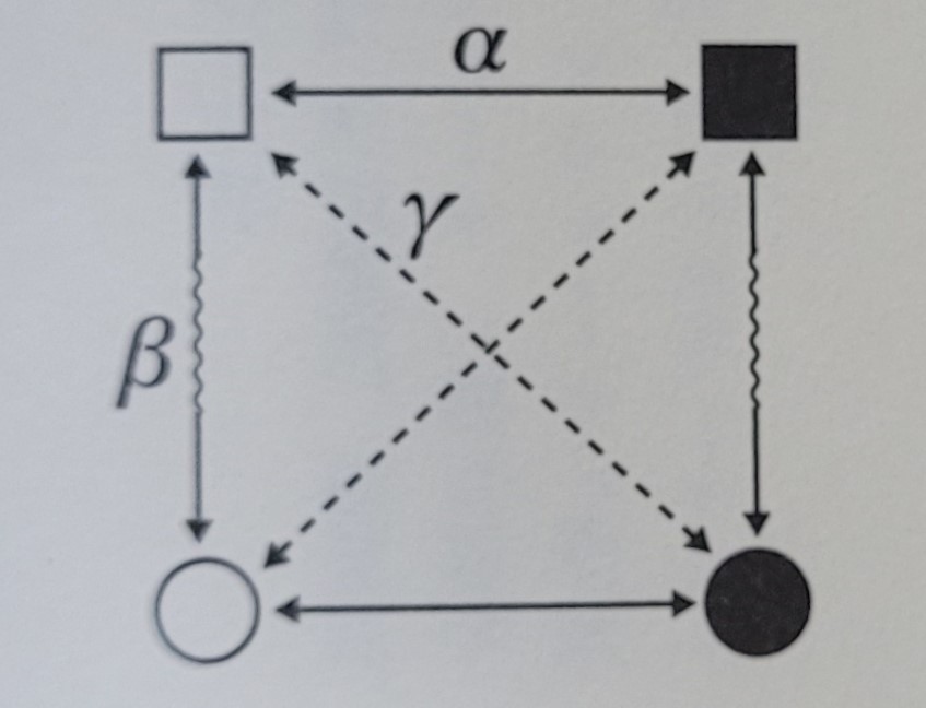 시미즈: 사실 순회시키는 가장 단순한 형태를 레비스트로스는 말했습니다. 이것은 숫자상으로 말하면 ‘클라인 4원군’이라는 것으로 두 종류의 이항대립을 조합시키는 방식입니다. 여기서는 알기 쉽게 이항대립을 색과 모양으로 하겠습니다. 하양과 검정이 있고 사각형과 원이 있다고 합시다. 이것을 조합해서 순회하는 구조를 그림으로 나타내면 그림 1과 같습니다. 여기서 검은 사각형과 하얀 사각형에서 사각형을 축으로 보면, 사각형은 ‘하양’과 ‘검정’이라는 반대 성질을 겸하게 됩니다. 즉, 사각형은 제3항인 것이지요. 그러나 예를 들어 ‘하양’을 축으로 보면 하얀 원과 하얀 사각형에서 하양은 ‘원’과 ‘사각형’이라는 반대의 성질을 겸합니다. 이때 하양이 제3항입니다. 이런 식으로 ‘하양’, ‘검정’, ‘원’, ‘사각형’은 모두 이항대립의 제3항의 위치를 점하며 그 역할이 순회합니다. 레비스트로스는 『신화학』에서 매우 복잡한 논의를 전개하지만 『친족의 기본구조』에서는 더욱 단순한 순회, 축약의 모델을 제시합니다.